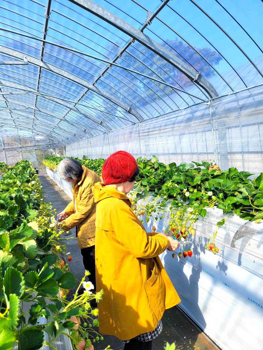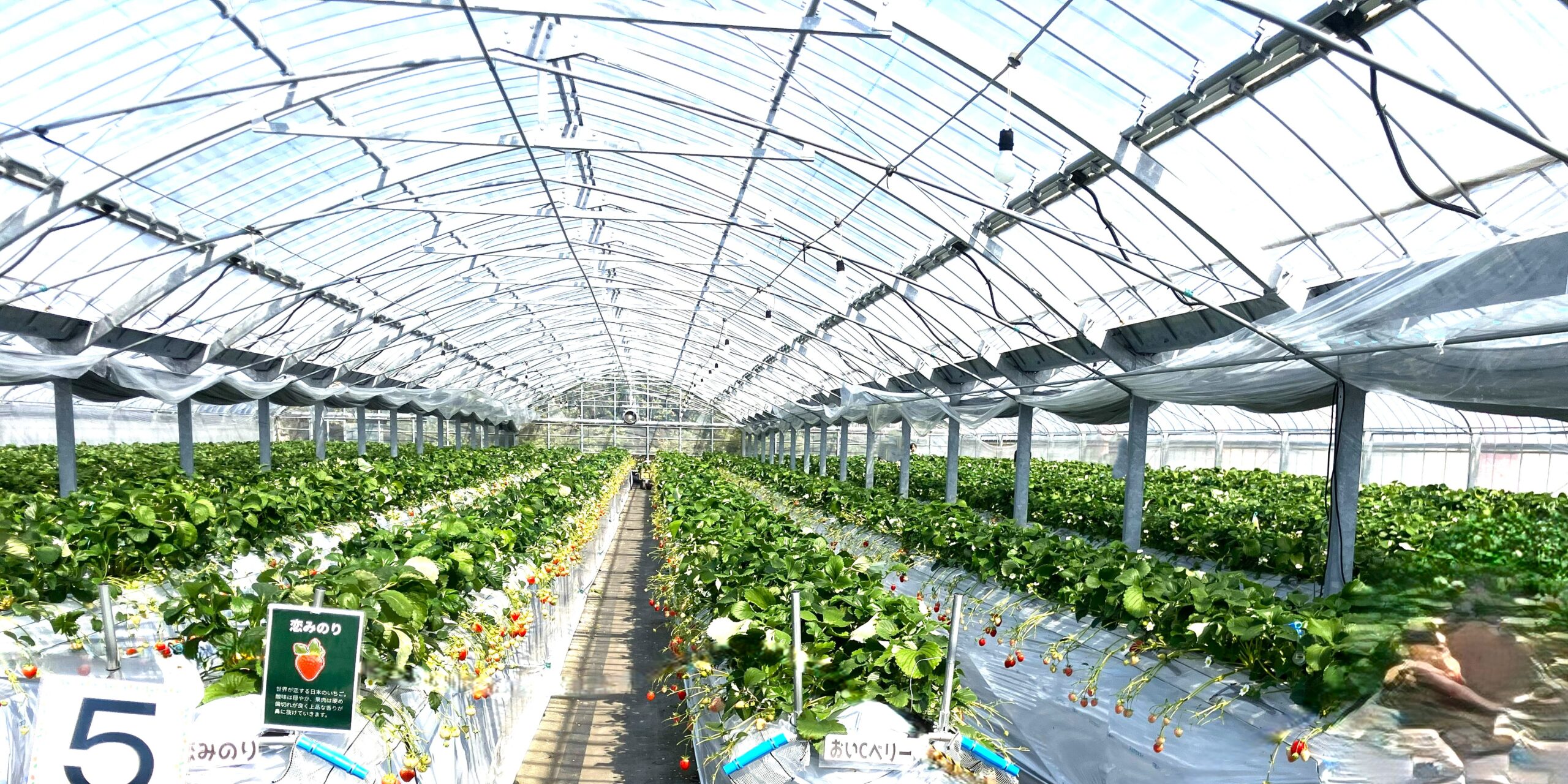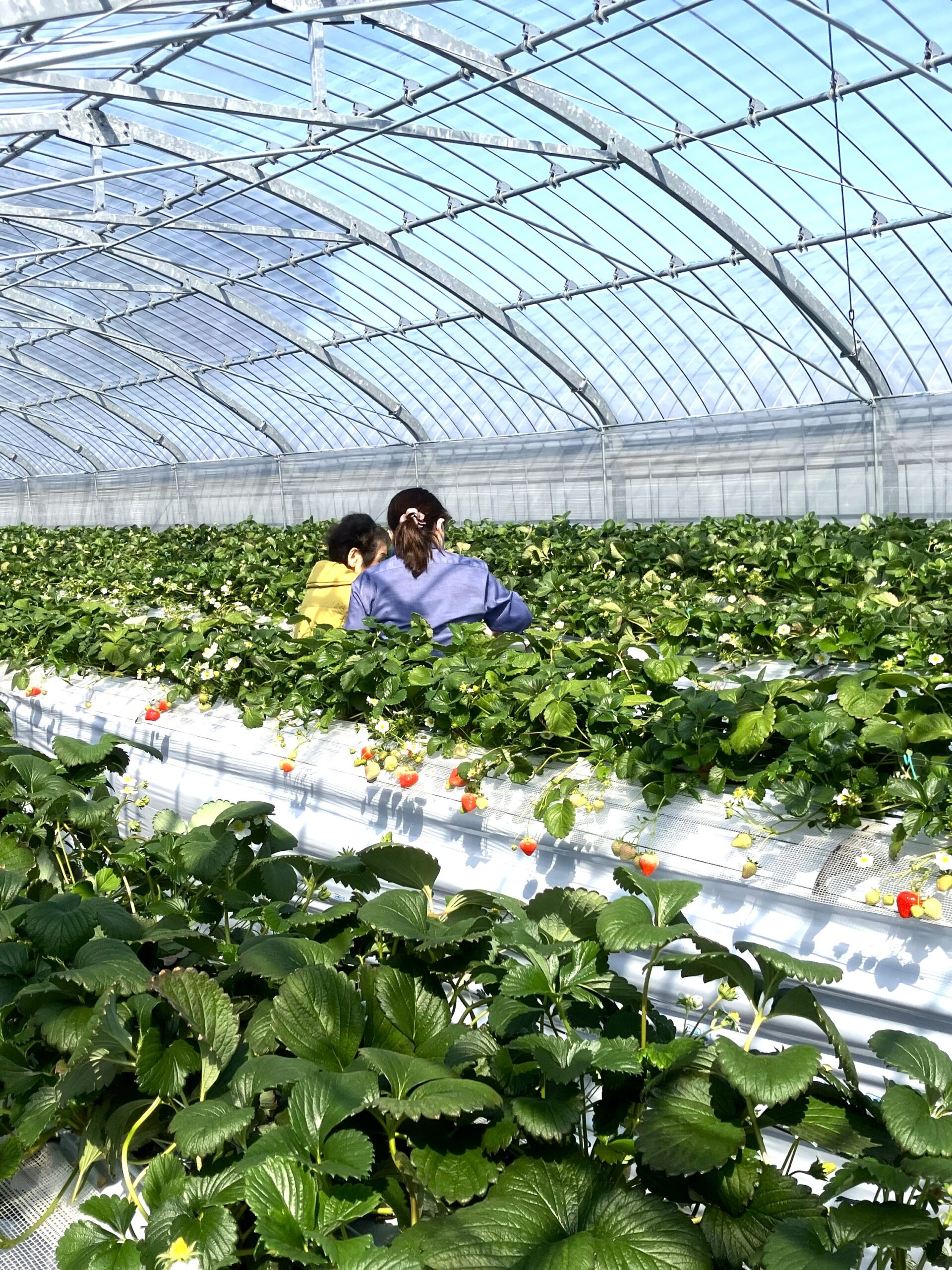 この農園は、足元がきれいに整備され、採りやすいように腰の高さに「いちご」が栽培されており、みなさんが安全に愉しめるようになっています